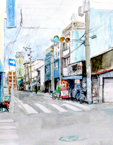 | 一昨年描いた、大阪、空堀のお好み焼き屋「平田商店」さんの前の道です。先日大阪市営地下鉄の広報誌「ノッテオリテ」vol13「ヒミツの大阪国」に平田のおっちゃんとこが、おおきく紹介されているのを見てびっくり。狭い店ですがおっちゃんとおくさん(淡島千景似)とお話しながらいただくお好み焼きはまあなかなかええもんです。 Madonna seriesはお休み。 |