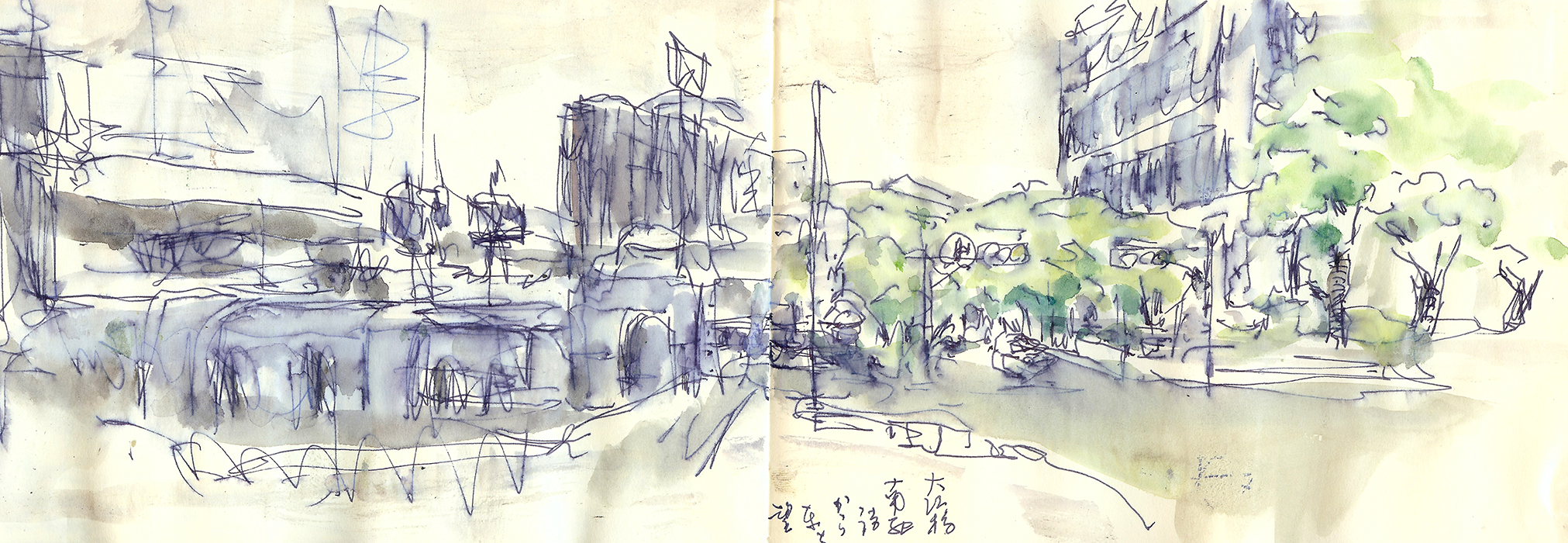堂島川畔、大江橋南西詰から、東を望む。昼休みのスケッチ。天牛堺書店へ立ち寄って、職場に戻る。