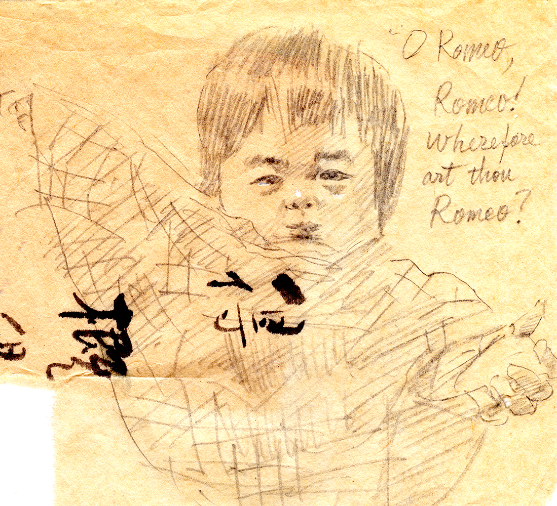 | | 落書きの 反故の端に描いた。 娘が孫のスナップを メールでくれた。 シェークスピアを演ずるような ポーズで写っている。 O Romeo, Romeo! wherefore art thou Romeo? ここら辺をクリックしてください。 蟾咳道人のインスタグラムへリンクします。 似顔絵、ペットの絵をお写真から描きます。 ご注文の コメントやメールを お待ちしております。 I draw the picture of your pet and your portrait. We look forward to your order. Please send me comments or mail. | |