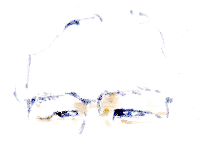 例によって、目から描き始める。その人らしさが見えてきたと思えたところで一度スキャニングする。フライドチキンのおやじではない。 | 途中、大橋巨泉氏が11PMの司会をなさっていた頃に似てきて困った。画仙紙絵葉書、墨、透明水彩、顔彩。20分。 |