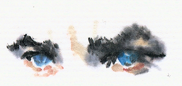 例によって、目から描き始める。この辺りで止めとけばよかったかな? | 画仙紙絵葉書、墨、透明水彩、顔彩。ジェームス・ディーン(James Dean)氏にも似ているような・・・・。 |