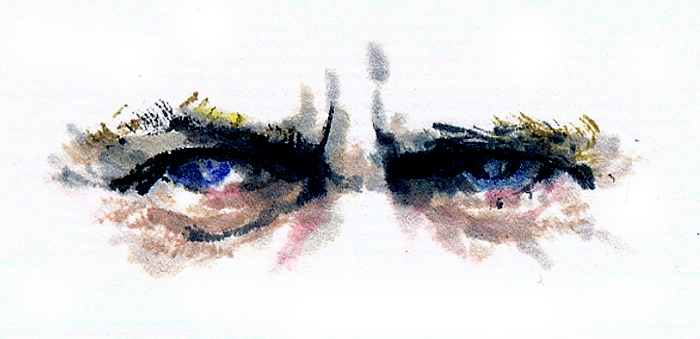 例によって、目から描き始める。 | 画仙紙絵葉書、墨、透明水彩、顔彩。30分。 |