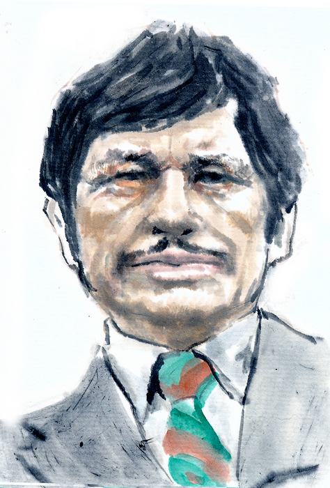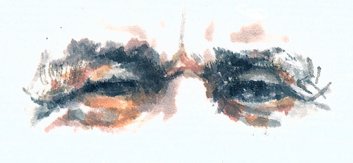 例によって、目から描き始める。 | 画仙紙絵葉書、墨、透明水彩、顔彩。30分。 |