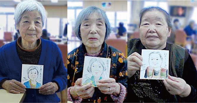 ブログに掲出してもええよと 言ってくださいました。 | ヘルスコープあかがわ生協診療所デイサービスセンターにお邪魔して、デイサービスセンターをご利用のみなさんの笑顔を描かせて頂いた。昼食の後のカラオケなどのお楽しみの時間にご希望される方々を描かせて頂いた。いろいろ、むかし話などを伺いながら描かせて頂くのだが、旧満州(中国東北地区)からの引き上げのはなしや、戦後の混乱の中での子育てのの苦労話にはついしんみりする。小さな色紙に10分ほどで描くのだが、描き終わる頃にはカラオケの「青い山脈」や「道頓堀行進曲」のメロディとともに笑顔にもっどて喜んでくださる。 |