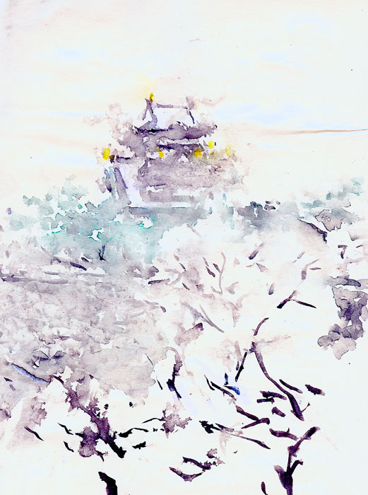 | 大阪に雪が降った。大阪城に出掛けた。梅林には、写真機、三脚を持った年配のみなさんで賑わっていた。パレットに降り積もる雪で絵の具を溶いて描いた、雪の大阪城です。梅林の茶屋で、絵の道具を片付けていると、横にやはりスケッチブックの絵に手を入れておられる方がいる。雪持ちの梅の枝のスケッチだ。つい話し掛けると、似顔絵も描いておられた、日本漫画の会のイシマルヒデさんであった。奥様とご一緒に雪の大阪城をスッケチしにお出でとのこと。絵の話や古い映画のはなしでしばらく花がさいた。 |