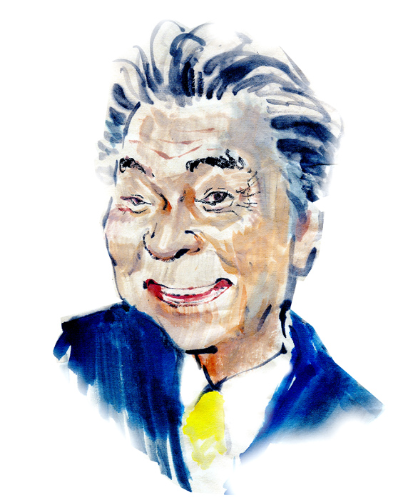 例によって、目から描き始める。その人らしさが見えてきたと思えたところで一度スキャニングする。フライドチキンのおやじではない。 | 途中、大橋巨泉氏が11PMの司会をなさっていた頃に似てきて困った。画仙紙絵葉書、墨、透明水彩、顔彩。20分。 |