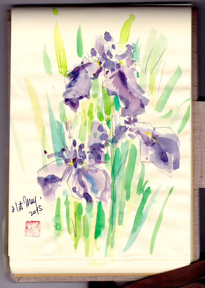 堤防から城北公園へ坂を下り、 菖蒲園へ。 菖蒲、紫陽花。それぞれに咲き小雨に濡れています。 この季節の花に雨がよく似合います。 菖蒲は、その原種と云はれる「野花菖蒲」がことのほか 清楚に、あたかも「野の花」の気品です。 素描して、帰りました。 |